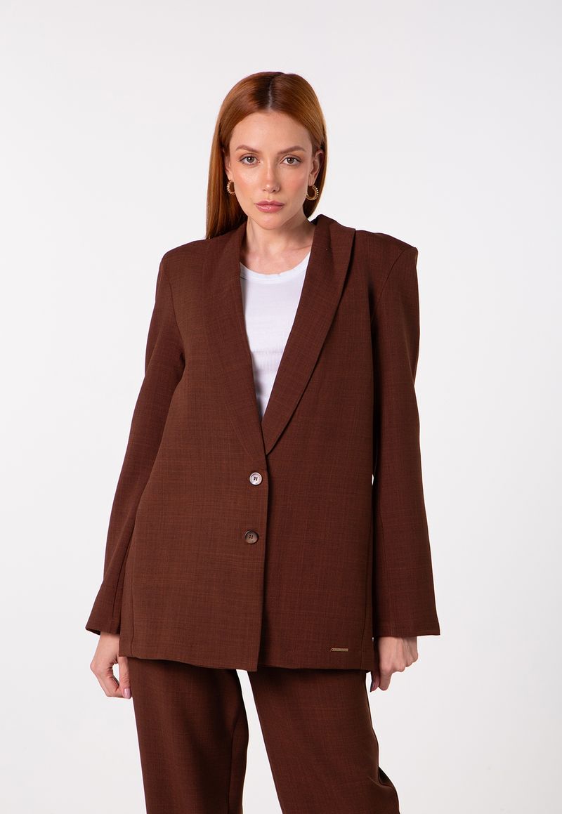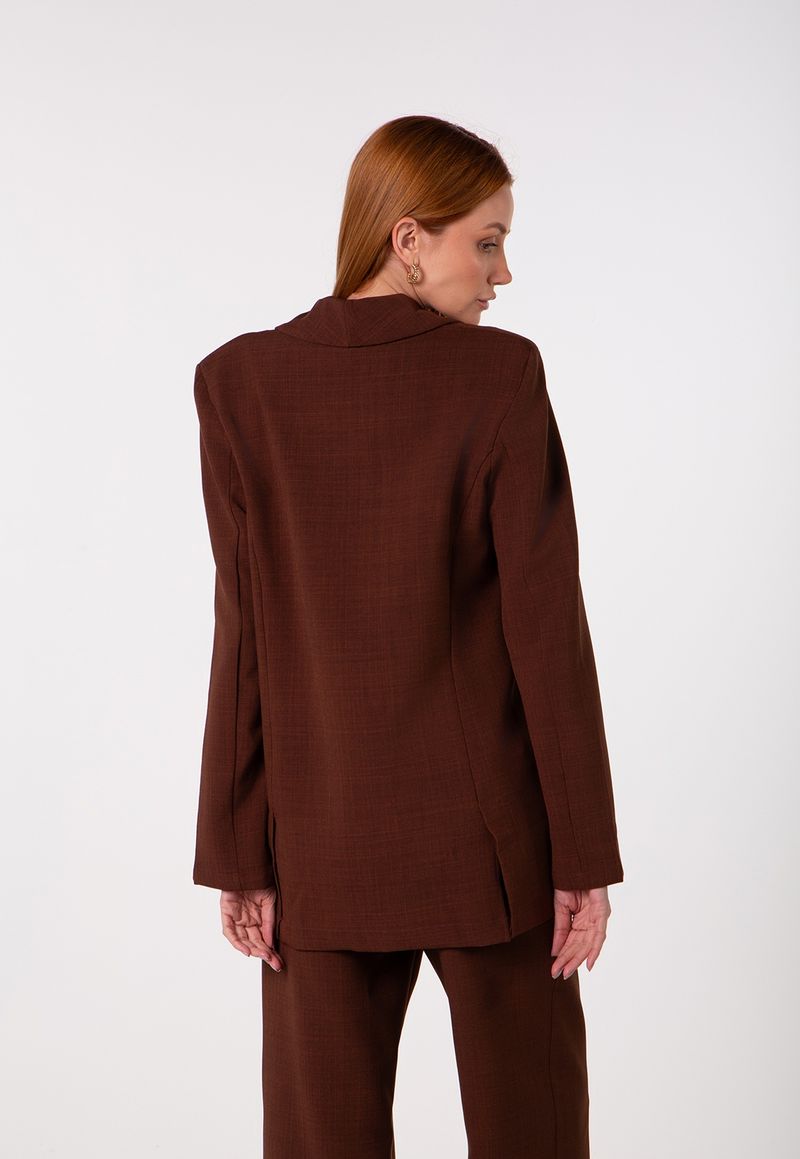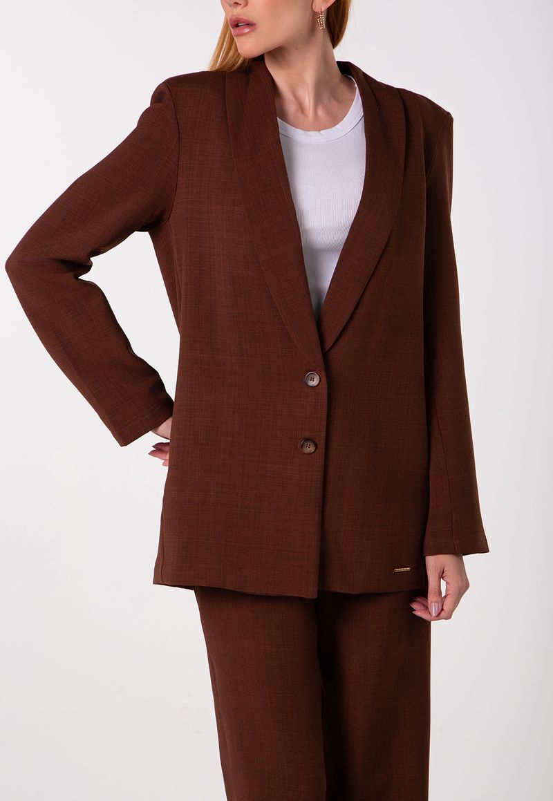 A modelagem estruturada proporciona presença ao visual, enquanto a lapela ampla adiciona personalidade e requinte ao design. O fechamento frontal por botões mantém a estética clássica da alfaiataria, e o comprimento levemente alongado reforça a proposta contemporânea.