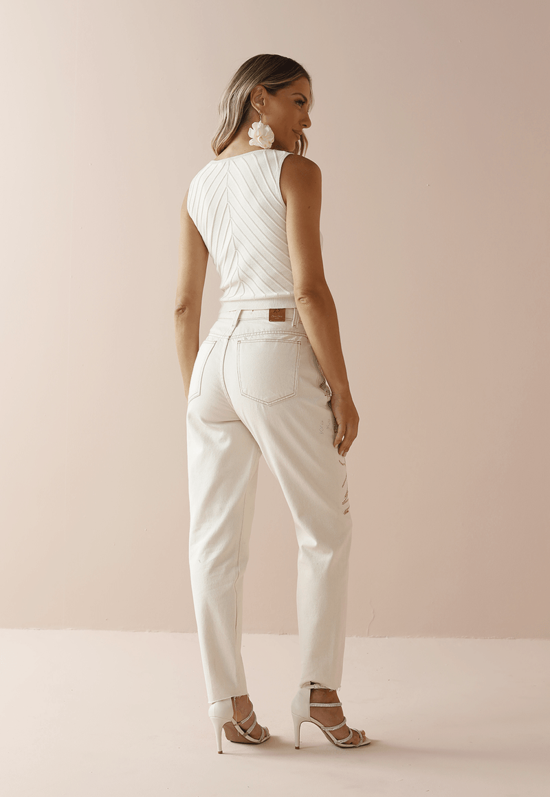 • Modelagem reta com cintura média • Bordado floral aplicado na lateral • Barra desfiada • Cor: Off White • Composição: 100% Algodão