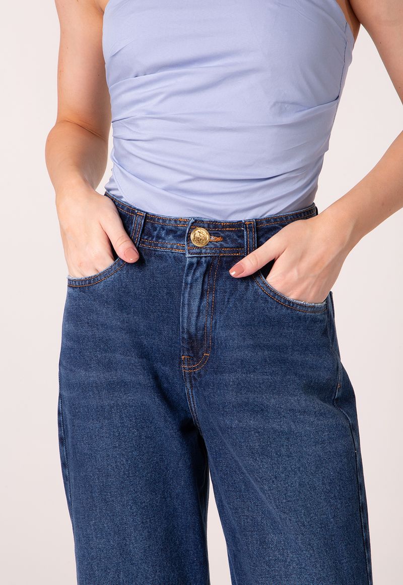 Diferenciais: • Modelagem reta com caimento solto. • Cós médio com passantes. • Bolsos frontais funcionais. • Lavagem jeans média com visual clássico. • Cor predominante: azul médio. • Composição: 98% algodão, 2% elastano.