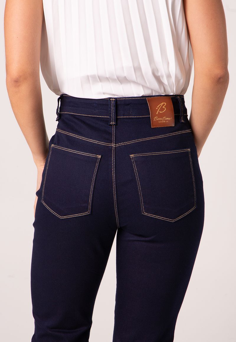 A lavagem escura valoriza o tom profundo do jeans e adiciona versatilidade à peça, que transita com facilidade entre ocasiões. A presença de elastano na composição garante conforto e liberdade de movimento, mesmo com a modelagem mais estruturada.