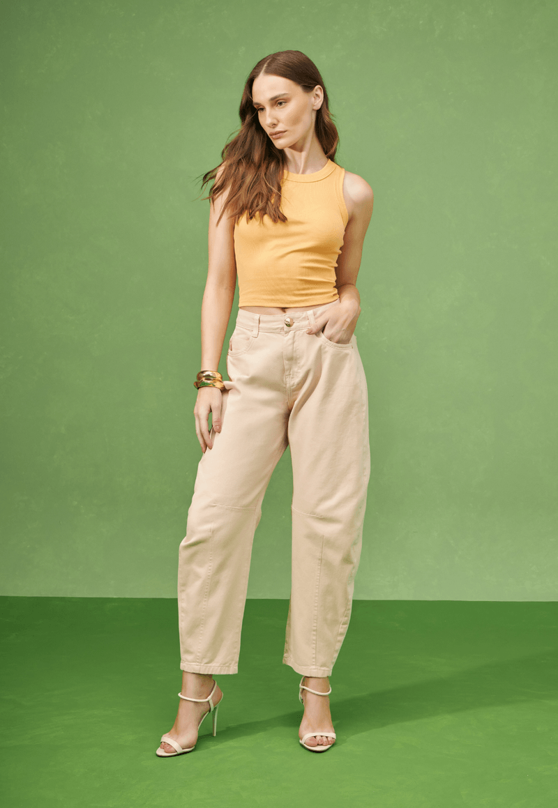 Na versão colorida, o denim ganha um novo protagonismo: a tonalidade clara cria uma base neutra e atual, ideal para compor com croppeds, camisas ou t-shirts vibrantes — um verdadeiro curinga para o guarda-roupa da temporada.