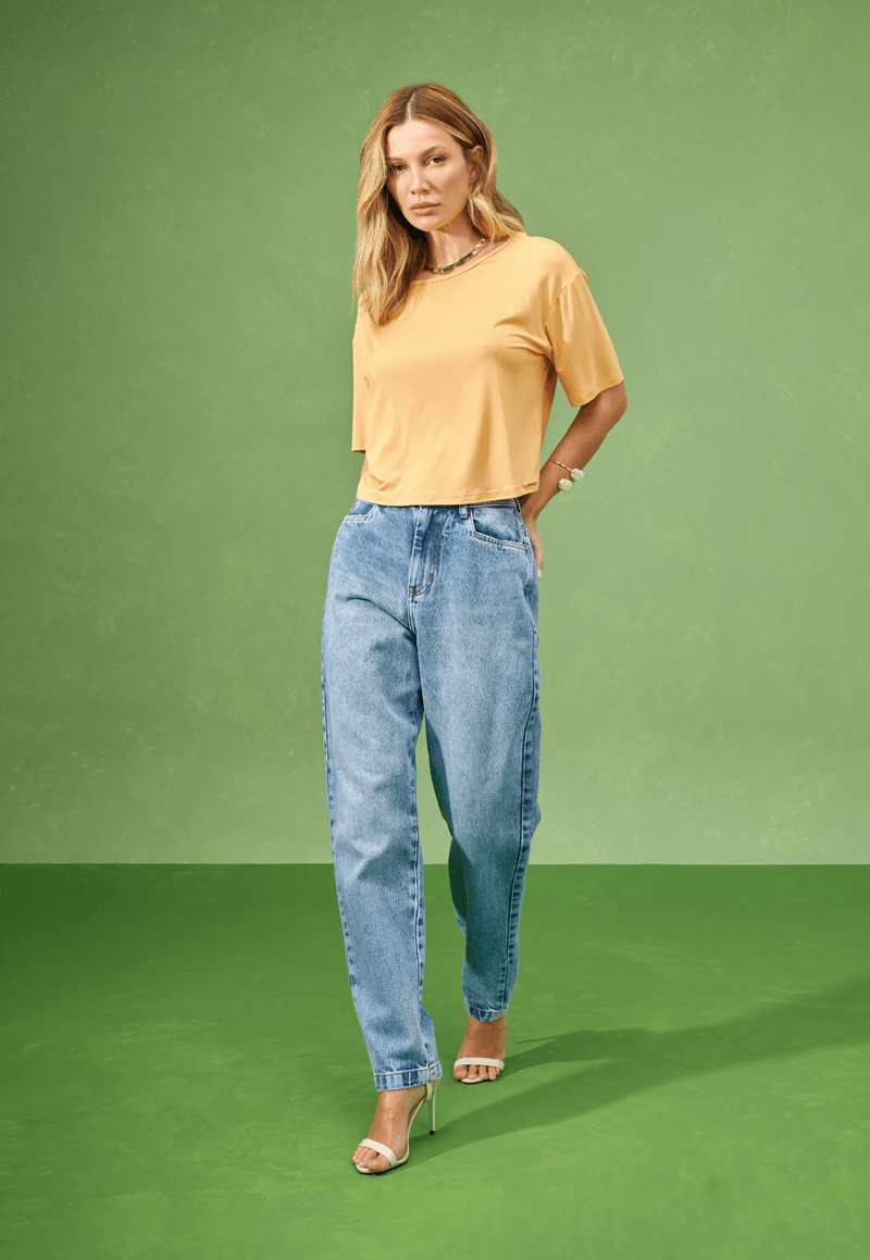 • Modelagem mom horseshoe com cintura alta e caimento amplo