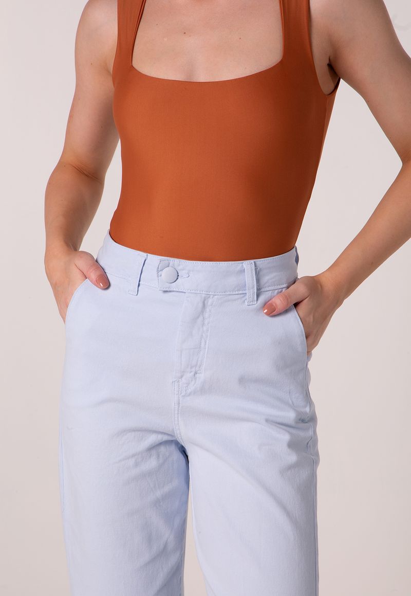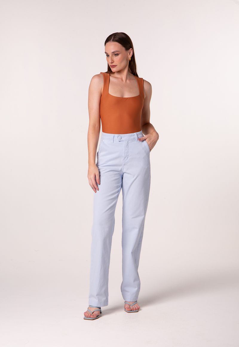 Confeccionada em jeans com elastano, garante conforto e mobilidade sem perder a estrutura.