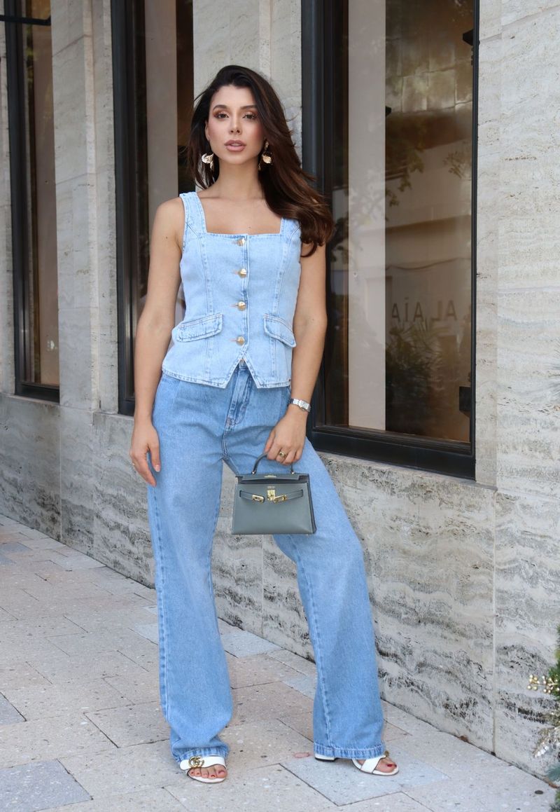 Diferenciais: Modelagem wide leg de pernas amplas Barra reta com acabamento tradicional Lavagem jeans clara que valoriza a peça Visual versátil para diferentes ocasiões