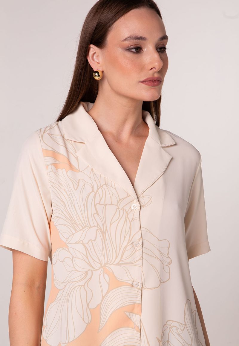 Com corte solto e caimento fluido, esta camisa é a escolha ideal para composições modernas e femininas. O design alongado com gola lapela e mangas curtas oferece um visual leve e despretensioso, enquanto a estampa floral delicada em tons suaves adiciona charme e frescor à produção.