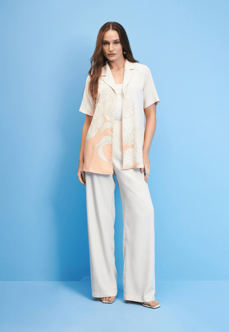 Confeccionada em tecido 100% poliéster, a peça garante toque macio, conforto e movimento natural. O tom off white com nuances pêssego amplia as possibilidades de styling — perfeita para ser usada aberta sobre tops e bodies ou fechada para um visual mais elegante.