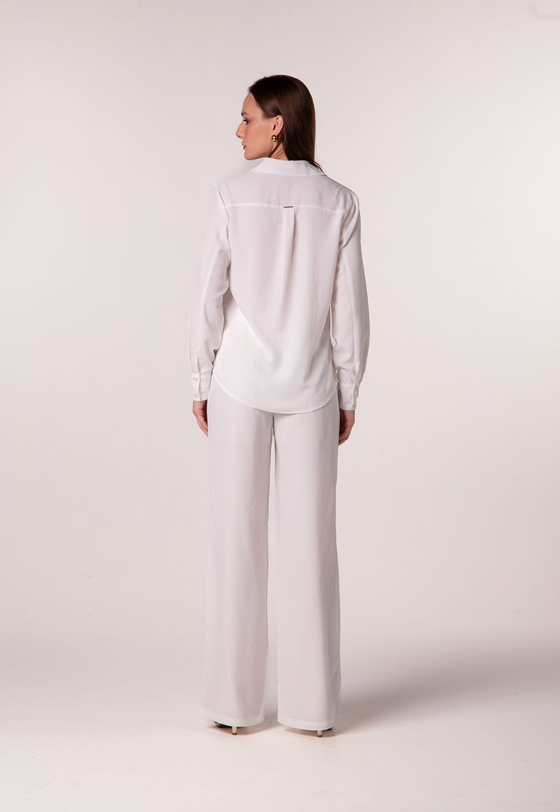 Confeccionada em 100% poliéster, o tecido oferece toque suave, caimento impecável e praticidade no uso diário. A cor branca é sinônimo de versatilidade, permitindo combinações que vão do look de trabalho às produções mais casuais, sem perder o charme e a leveza.