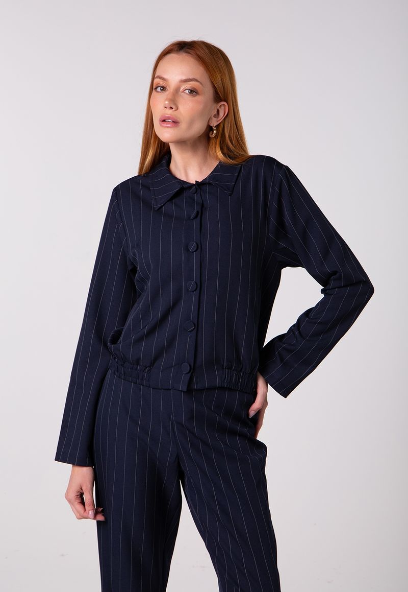 O fechamento frontal por botões e a gola clássica reforçam o visual refinado, enquanto o elástico na barra adiciona um toque atual e garante melhor ajuste ao corpo. Perfeita para combinar com a calça coordenada ou usar como peça-chave em produções urbanas.
