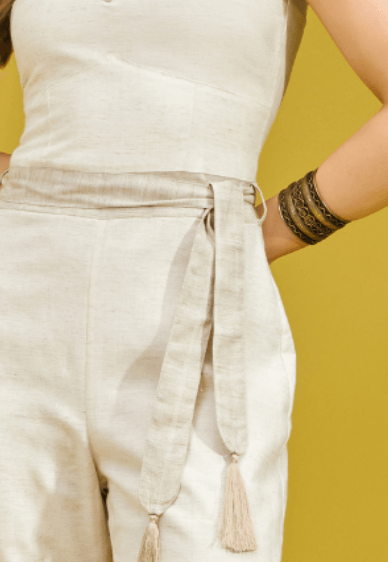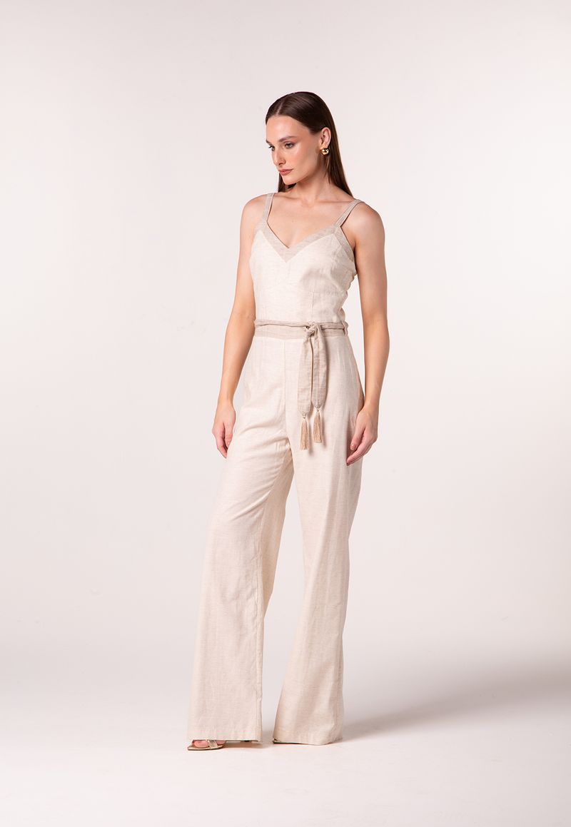 A cintura é valorizada por um cinto removível com acabamento em tassel, que acrescenta um toque artesanal à composição. Ideal para momentos que pedem estilo e conforto, o modelo combina perfeitamente com ocasiões que vão do casual chic ao resortwear refinado.