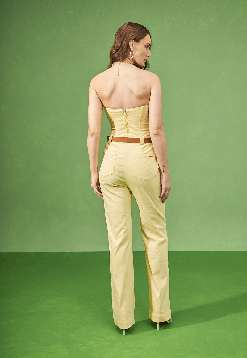 As linhas limpas e o decote reto criam um visual moderno e refinado, que transita bem entre o dia e a noite. A calça de corte reto alonga a silhueta e garante um caimento elegante em diferentes tipos de corpo.