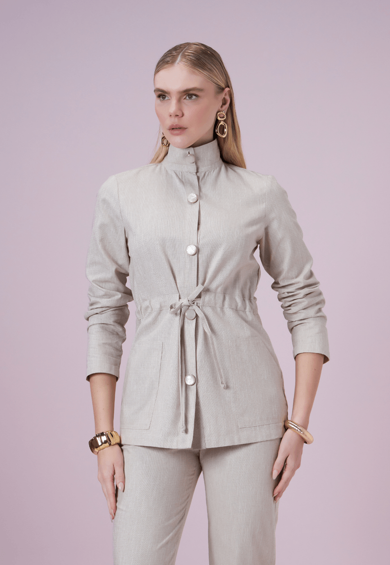 Confeccionada em tecido encorpado com toque natural, que combina algodão, viscose e linho, a peça garante leveza e estrutura na medida certa. Versátil, pode ser usada em produções elegantes com alfaiataria ou em looks casuais modernos com jeans e t-shirts.