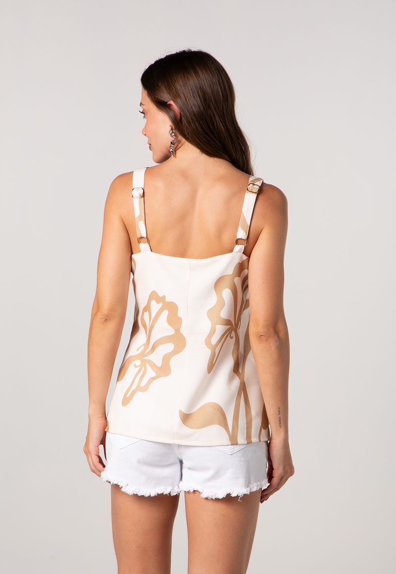 A regata com alças largas e caimento solto é a tradução da elegância leve para os dias mais quentes. Sua modelagem fluida cria um visual descomplicado e refinado, ideal para composições com peças de cintura alta ou para coordenar com a saia midi da mesma estampa.