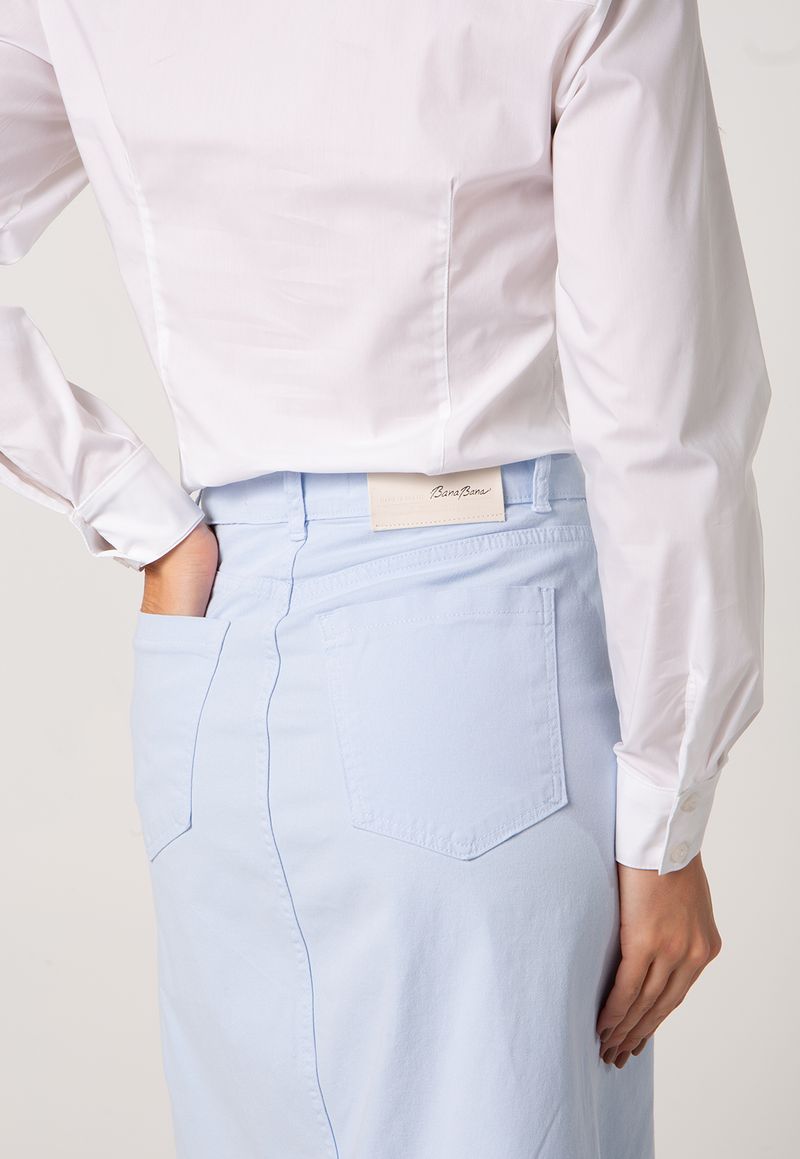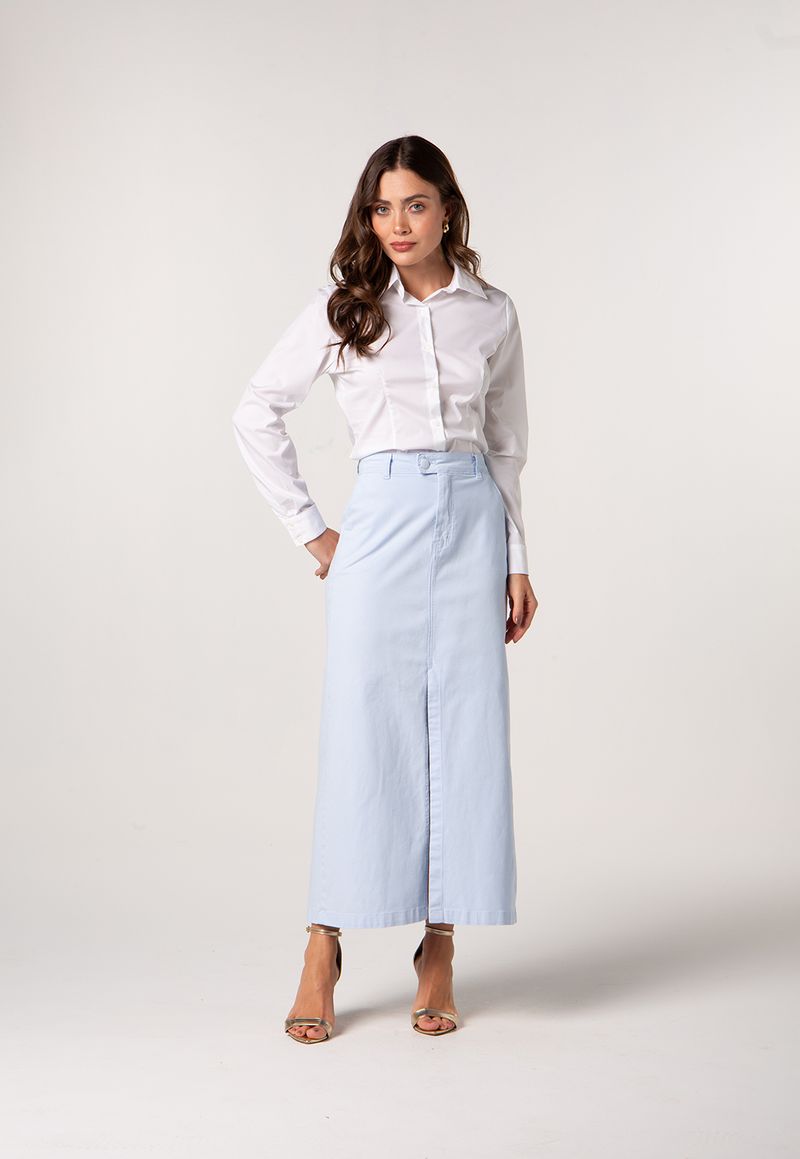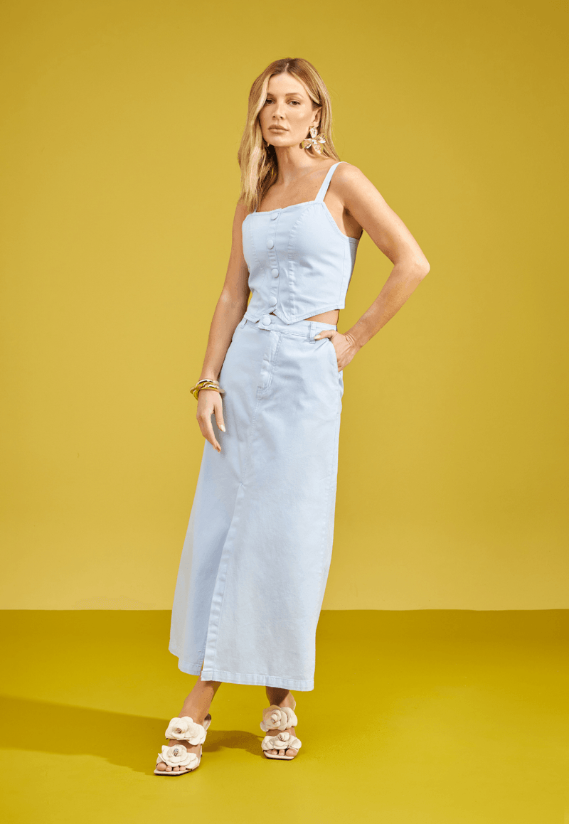 Essa saia jeans traz o comprimento midi combinado à modelagem mom para um visual moderno e despojado. A abertura frontal adiciona leveza ao movimento e reforça o estilo prático da peça. Com cintura alta e estrutura clássica, é ideal para produções coordenadas, especialmente quando usada com o top do mesmo tom.