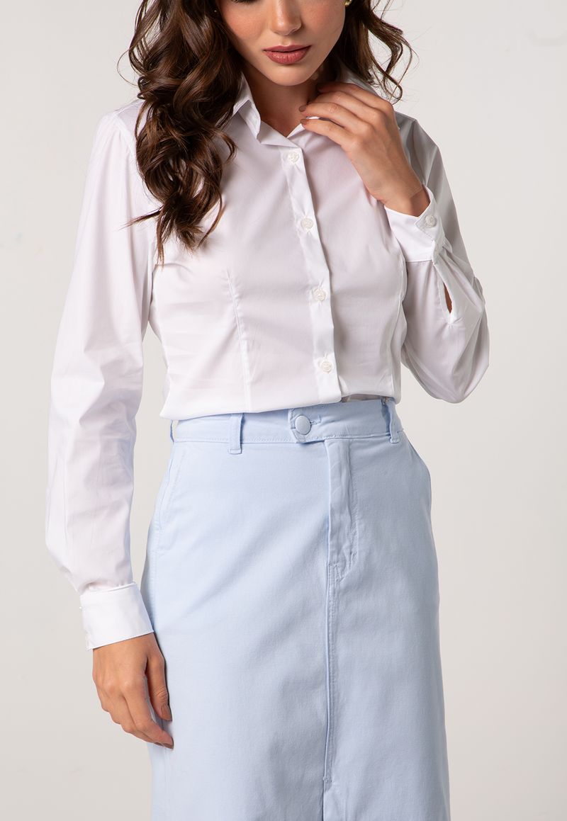 Confeccionada em jeans com elastano, garante conforto, caimento ajustado e um toque contemporâneo.