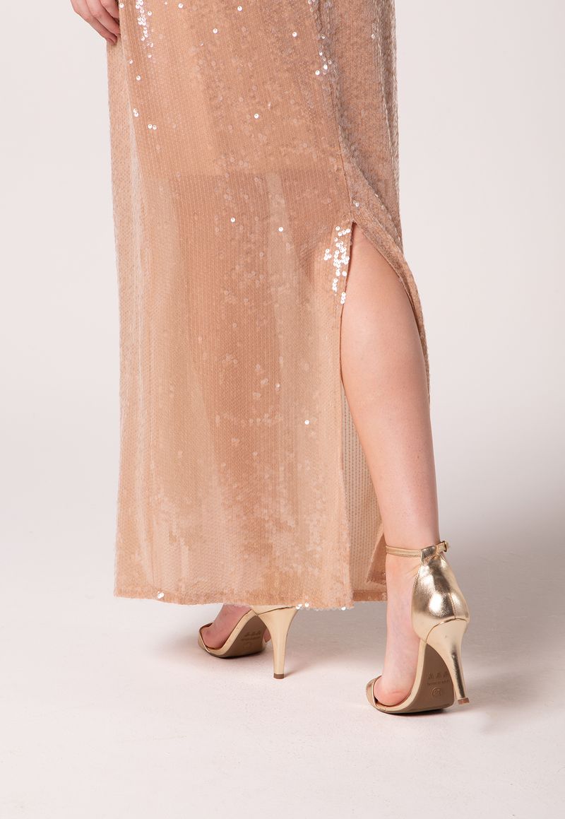Com caimento reto e acabamento impecável, esta saia longa de paetês é a escolha ideal para produções noturnas e ocasiões especiais. A superfície brilhante confere glamour imediato, enquanto a modelagem reta alonga a silhueta com elegância.