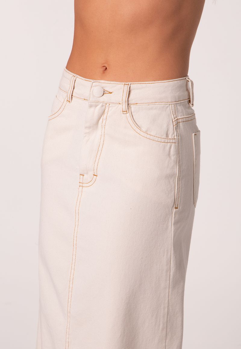 A saia midi Amanda combina o charme clássico da modelagem reta com o toque moderno do jeans em tonalidade clara. Seu comprimento alongado confere sofisticação, enquanto o cinto com fivela em textura natural valoriza a silhueta com estilo leve.
