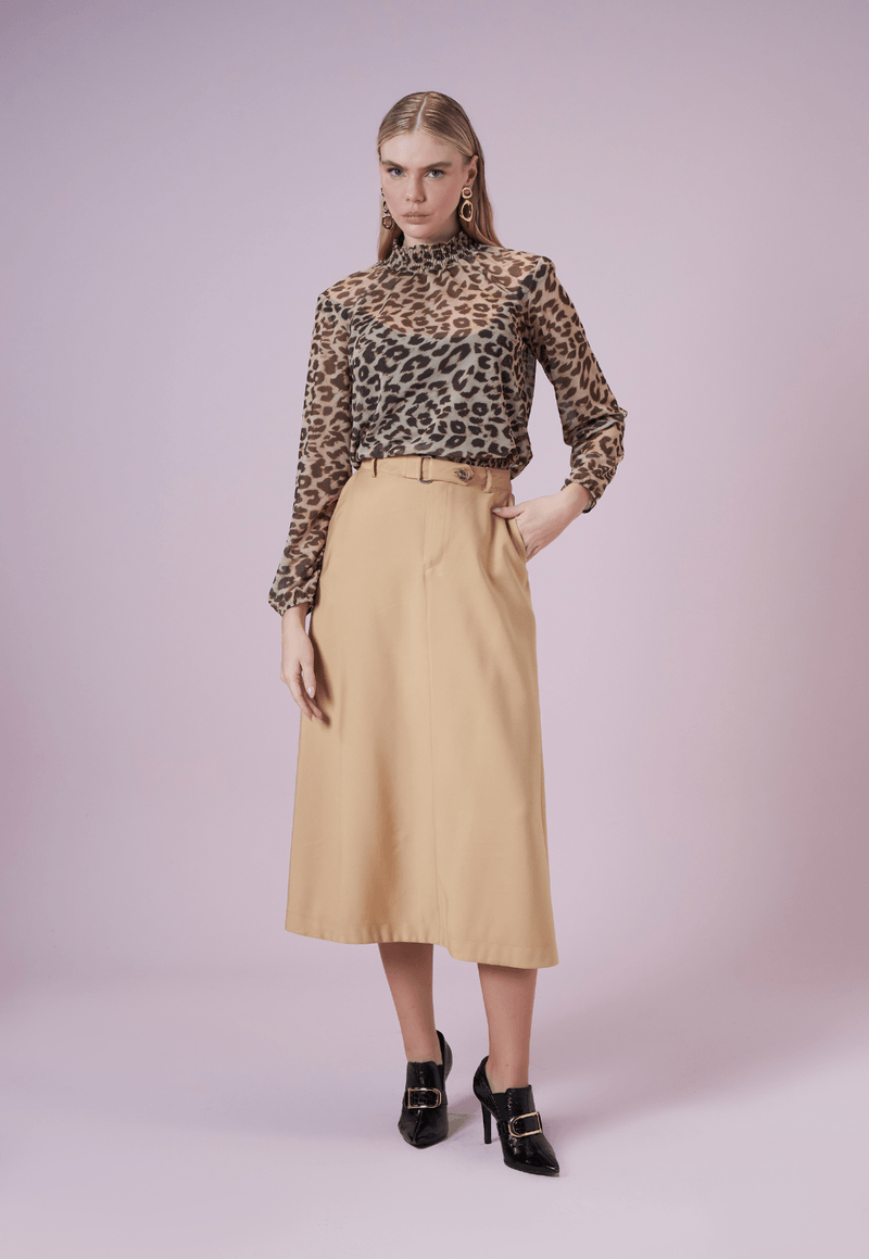 A saia midi com cinto é a peça ideal para quem busca elegância atemporal com versatilidade. Com modelagem evasê e cintura marcada, valoriza a silhueta de forma equilibrada, enquanto o comprimento midi reforça a sofisticação do design. O cinto do mesmo tecido com fivela forrada complementa o visual, adicionando um toque refinado ao conjunto.