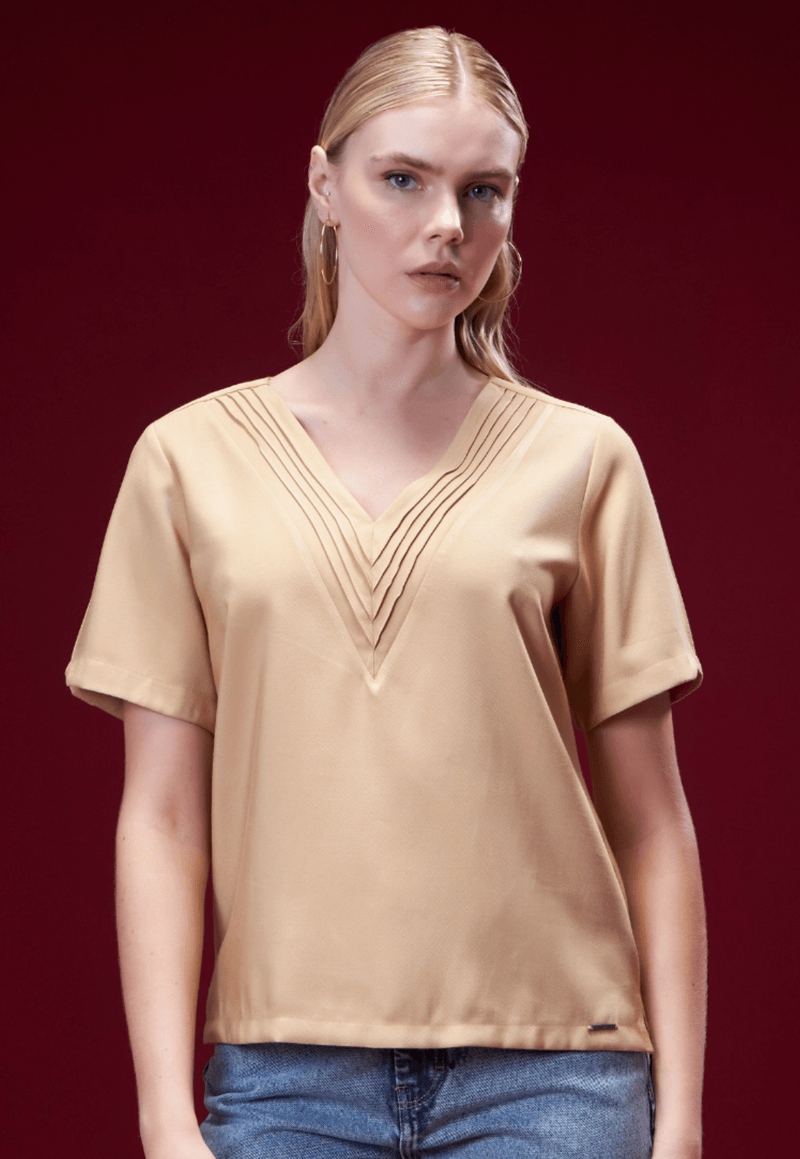 A t-shirt com decote V ganha destaque pelo acabamento em pregas delicadas que formam uma moldura elegante na gola. Sua modelagem reta garante caimento confortável, enquanto o design versátil permite combinações tanto casuais quanto refinadas.