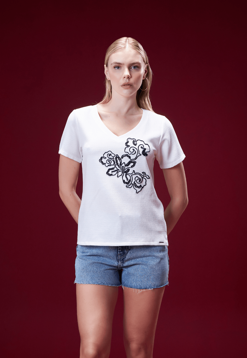 Com design clean e toque sofisticado, a t-shirt se destaca pelo bordado floral em contraste, que valoriza a frente da peça com um detalhe elegante e atemporal. O decote em V complementa a modelagem clássica, alongando a silhueta e garantindo feminilidade em qualquer ocasião.