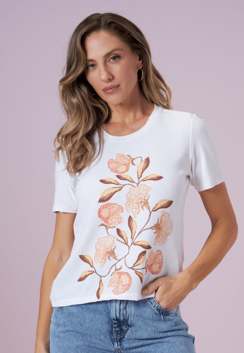 A t-shirt floral com pedrarias une o charme das estampas botânicas à sofisticação de detalhes aplicados. Com modelagem reta e caimento leve, a peça se destaca pela estampa vertical de flores em tons suaves, enriquecida com aplicações de pedrarias que conferem luminosidade refinada ao visual.