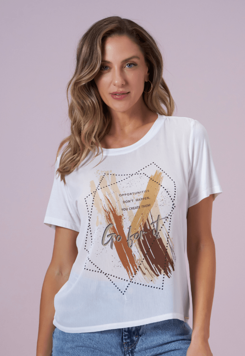 Casualidade moderna com toque inspirador A t-shirt estampada une conforto e estilo em uma proposta despojada e cheia de personalidade. Com modelagem reta e caimento leve, é perfeita para o dia a dia. O destaque fica por conta da estampa localizada frontal, que traz pinceladas de cor e a frase motivacional “Go For It”, conferindo atitude ao visual. Versátil, combina facilmente com jeans, shorts ou saias, sendo uma peça-chave para composições casuais práticas e estilosas. O tecido de viscose com toque macio garante frescor e bem-estar durante o uso.
