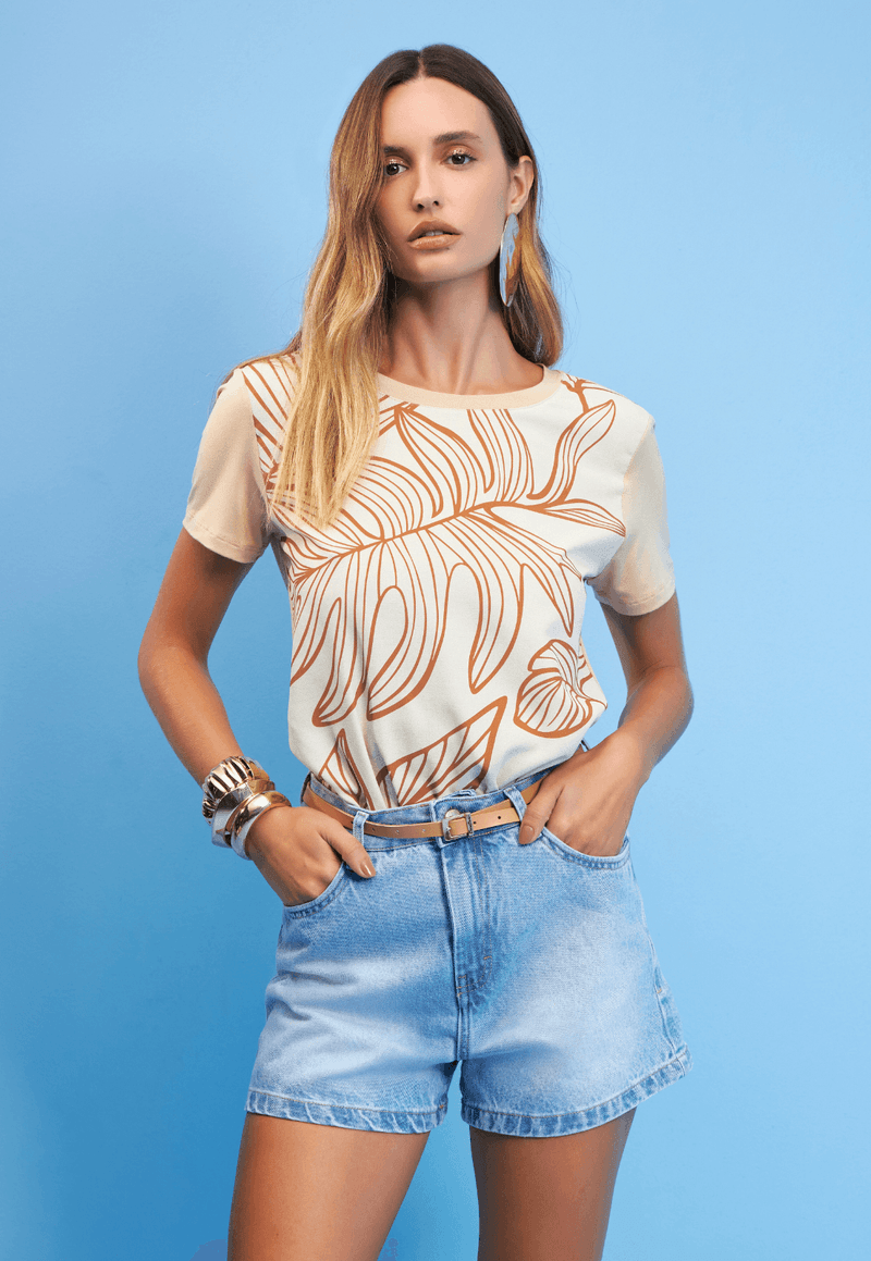 A T-shirt combina conforto e estilo com uma estampa inspirada nas formas naturais da flora, trazendo um toque artístico e moderno para o visual. O desenho botânico em contraste delicado adiciona personalidade à peça, enquanto o caimento soltinho e o decote redondo valorizam a silhueta com elegância.