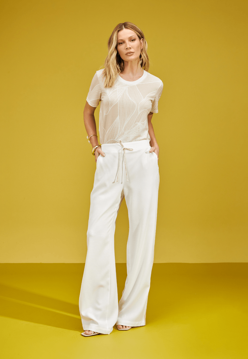 A gola redonda em retilínea confere acabamento limpo e contemporâneo, enquanto o tecido com toque acetinado proporciona conforto com leve elasticidade, garantindo caimento impecável ao corpo.