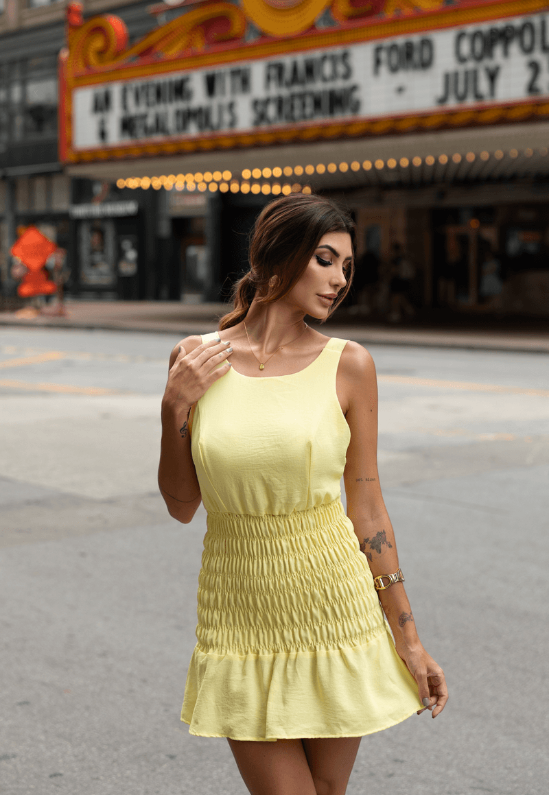O vestido curto com lastex na cintura é a definição perfeita de feminilidade descontraída. Com um caimento que valoriza o corpo com suavidade, ele combina o busto solto e fluido com a cintura marcada e a saia levemente rodada, criando uma silhueta elegante e ao mesmo tempo descontraída. O decote fechado e as alças mais largas conferem sofisticação ao visual, enquanto o lastex oferece conforto e praticidade.