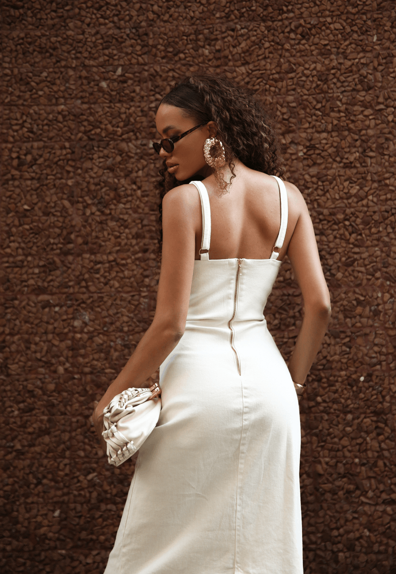 Minimalismo com sofisticação artesanal Este vestido jeans midi é a união perfeita entre elegância atemporal e o toque contemporâneo do jeans. Sua modelagem ajustada valoriza as curvas com leveza, enquanto o comprimento midi confere sofisticação à silhueta.