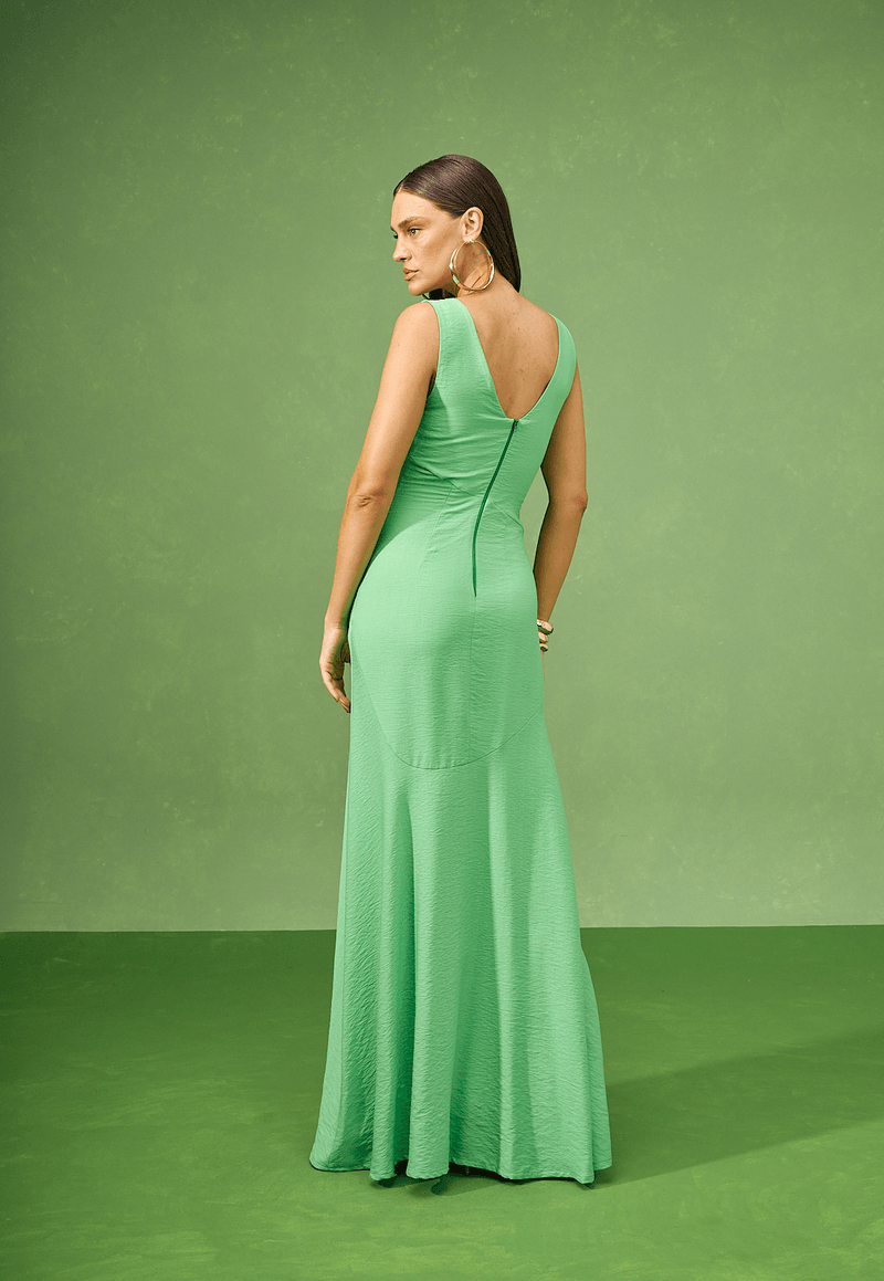 O vestido longo aposta na silhueta feminina com um design que combina leveza e estrutura. A modelagem fluida se contrapõe a recortes estratégicos, que criam um efeito de cintura marcada e valorizam o corpo com sofisticação.