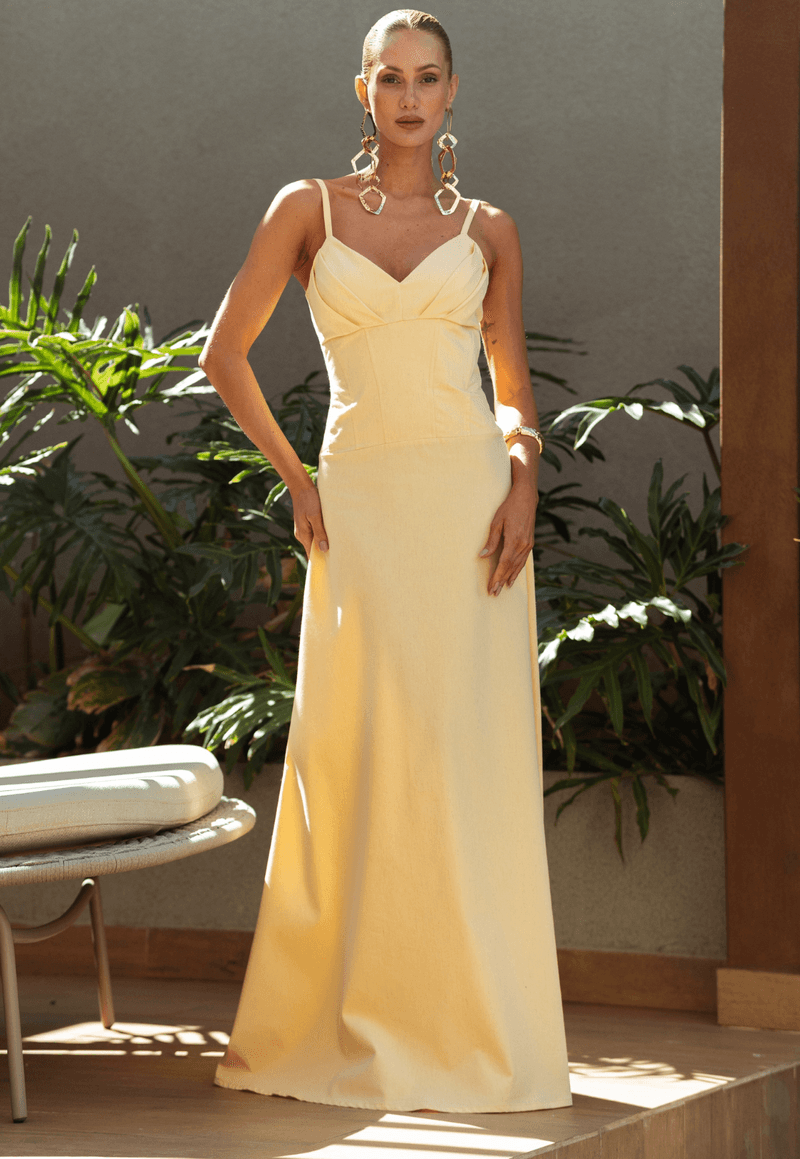 Com design fluido e silhueta marcante, o vestido longo com recorte no busto é uma escolha sofisticada para ocasiões especiais ou composições elegantes do dia a dia. A parte superior estruturada com alças finas e decote drapeado valoriza o colo com sutileza, enquanto o recorte na cintura alonga a silhueta.