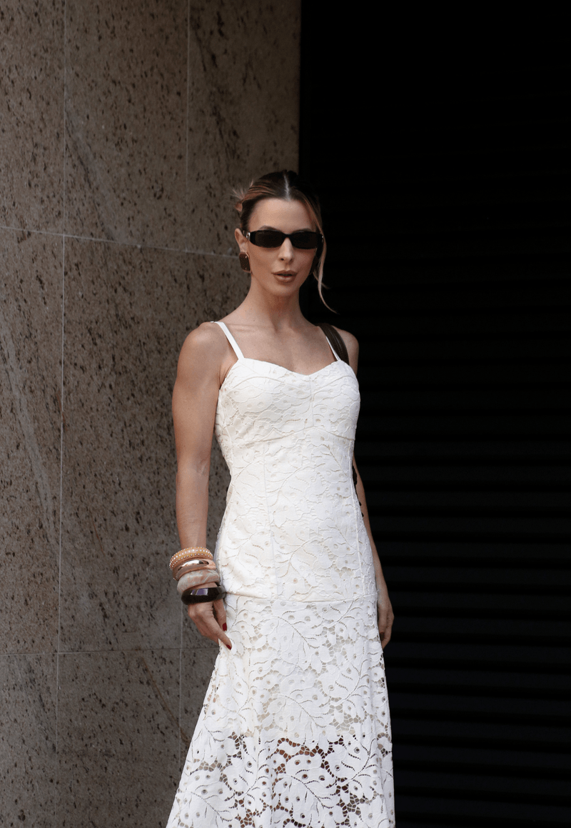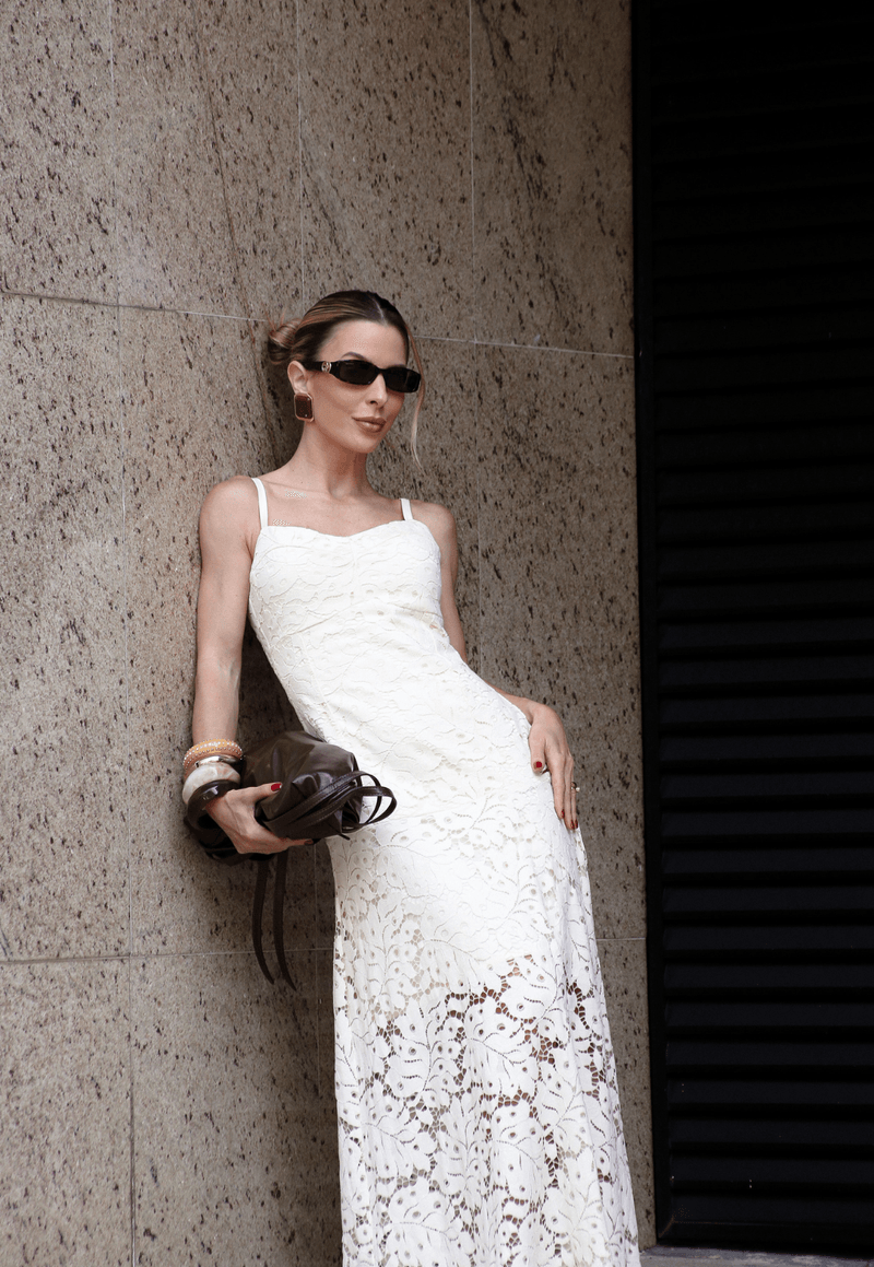 O vestido longo com renda e alças finas é a escolha ideal para quem busca um visual feminino com toque sofisticado. A silhueta ajustada valoriza o corpo de forma elegante, enquanto o trabalho rendado confere textura e leve transparência na medida certa.