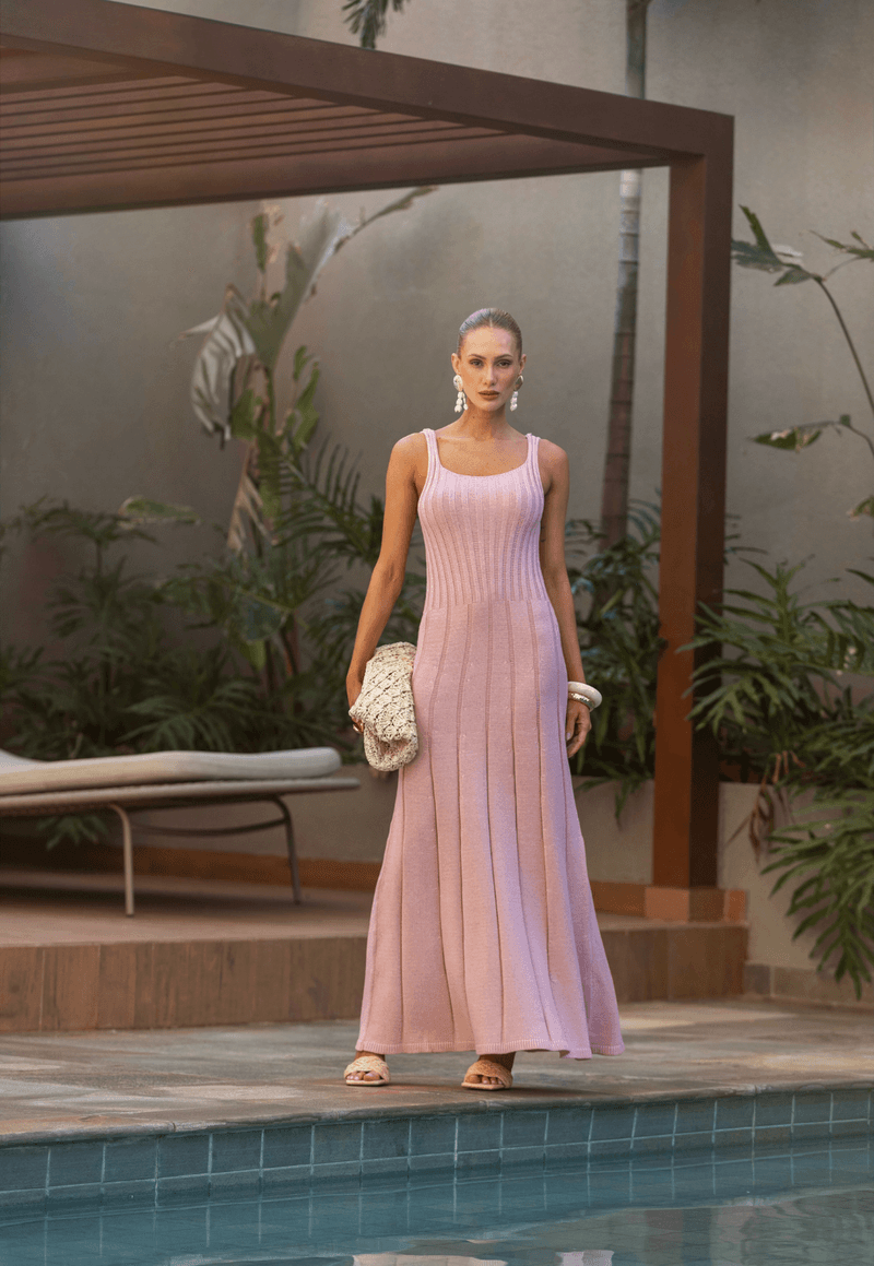 Movimento e textura: o vestido longo de tricot para dias de elegância leve Com caimento fluido e visual alongado, o vestido longo de tricot com decote quadrado é a peça ideal para composições elegantes em clima de verão. A modelagem ajustada no busto e evasê na saia valoriza as formas com naturalidade, enquanto a trama canelada vertical traz textura e sofisticação ao look.