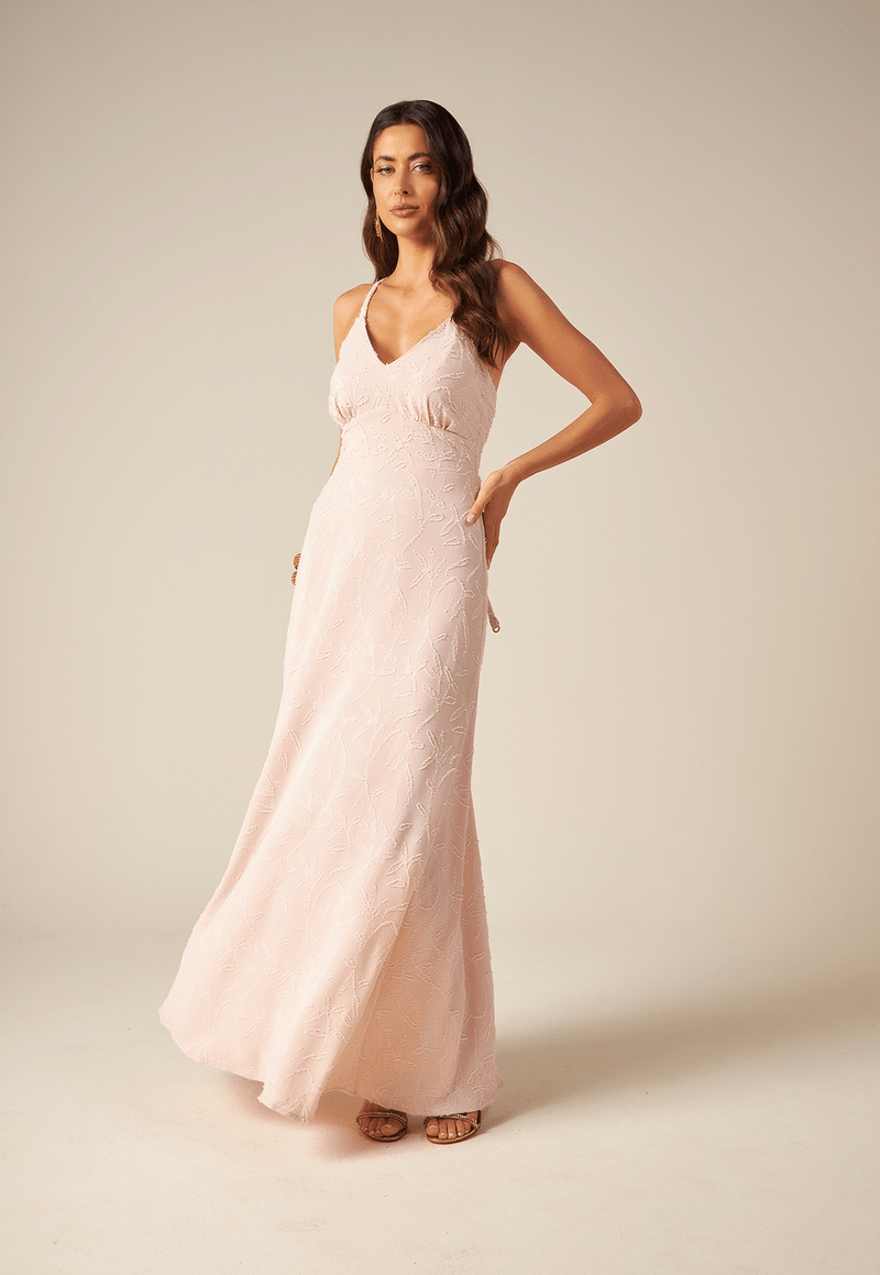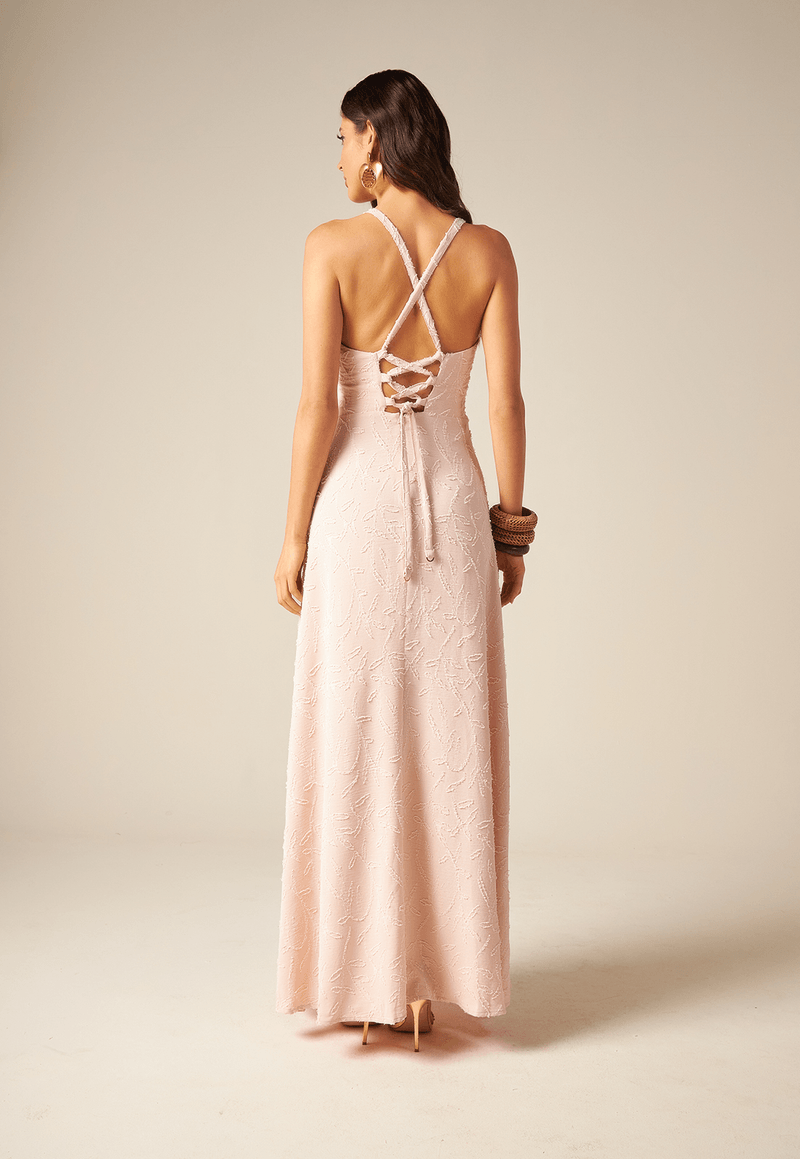 Confeccionado com, tecido airflow jacquard summe II e poliéster, este vestido apresenta bordado.