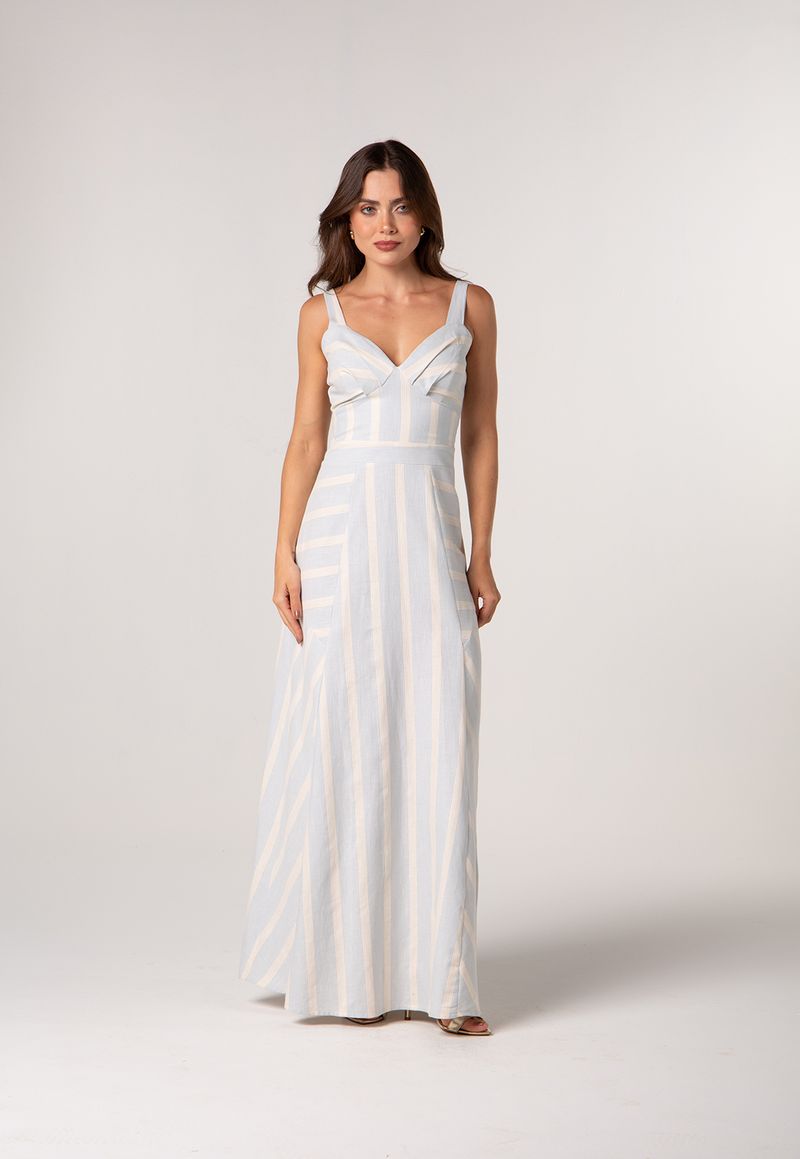 O vestido longo listrado traduz elegância leve e um toque contemporâneo. Com recorte estruturado no busto e modelagem que valoriza a silhueta, a peça une frescor e sofisticação em um design atemporal.