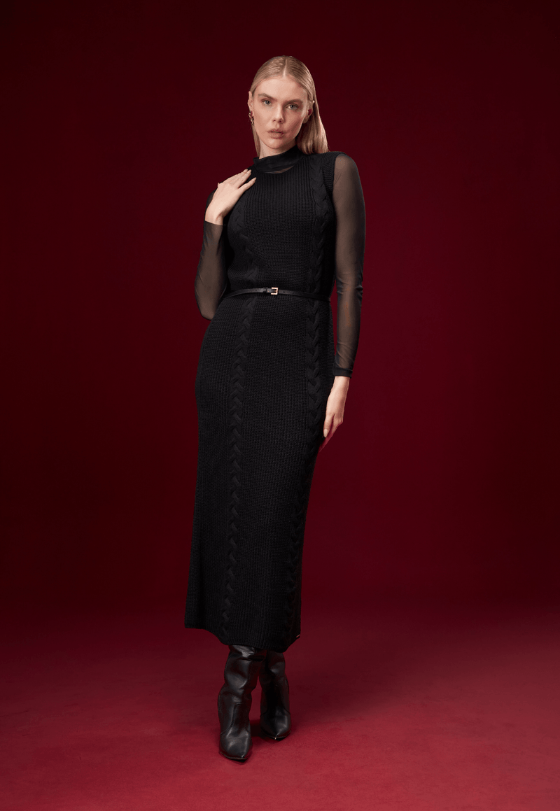 O vestido longo de tricot em tom preto apresenta uma proposta sofisticada e atemporal. A modelagem reta valoriza a silhueta com naturalidade, enquanto a textura em tranças confere um toque clássico e refinado.