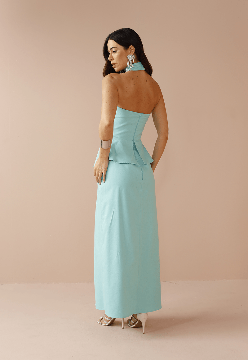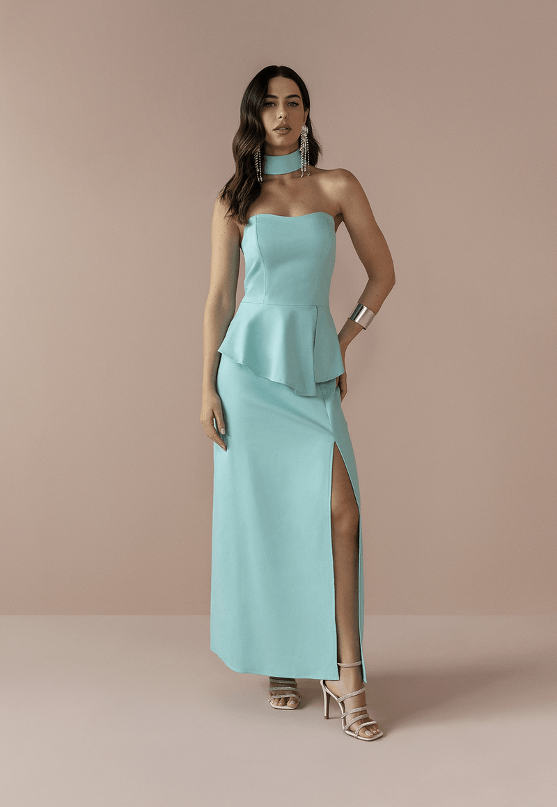 Confeccionado em algodão, o vestido apresenta comprimento midi, modelagem tomara-que-caia e peplum, babado e chocker do mesmo tecido que a peça.
